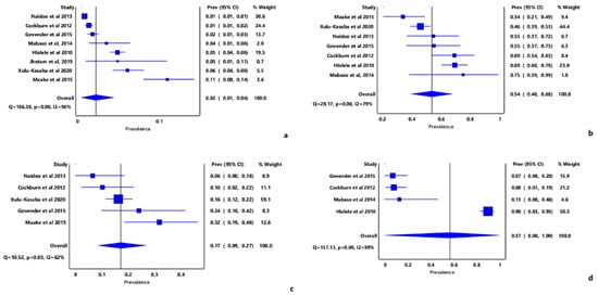 Forest plot of the prevalence estimates of blindness and its major causes in South Africa; (a) Overall blindness prevalence, (b) Cataract, (c) Glaucoma, (d) diabetic retinopathy.