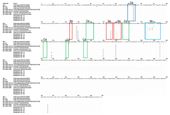 Alignment of the coding amino acid sequences of HA1 antigenic sites in the four strains isolated in Bangladesh in the present study. The coding amino acid sequences of HA1 were aligned to that of the reference strain, A/Michigan/45/2015. The H1N1pdm09 subclades and strain names are indicated on the left side of the figure. The amino acid sequences of each antigenic site are indicated as follows: Sa site (red box), Sb site (light blue box), Ca site (green box), and Cb site (dark blue box).