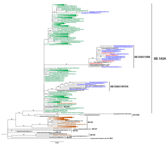 To investigate the subclades that have circulated in Bangladesh in the past, the HA sequences of Bangladesh strains of human IAV H1N1pdm registered in the EpiFlu GISAID database between January 2018 and March 2021 were collected, and a phylogenetic analysis was performed. The sequence dataset consisted of 376 strains (124, 212, and 18 strains registered in 2018, 2019, and 2020, respectively), the four sequences obtained in the present study, and 20 reference strains of 6B.1A and 6B.1A1-A7. Results showed that 122 of 2018 strains were clustered with Ireland/84630/2018, the reference strain of the subclade 6B.1A6 defined by the amino acid substitutions T120A and S183P (Figure 2). The remaining two 2018 strains were classified as either 6B.1A2 or 6B.1A5A (Figure 2, Supplementary Table S3). On the other hand, all of the 2019 strains belonged to subclade 6B.1A5A. Remarkably, the subclade 6B.1A6 that dominated in 2018 had completely disappeared in 2019. Eighteen strains registered in 2020 and the four strains of the present study belonged to subclade 6B.1A5A, which was further phylogenetically classified into three genetic groups: (1) two strains (9.1%) were related to the parental subclade 6B.1A5A strain; (2) five strains (22.7%) belonged to the 6B.1A5A + 187V/A subclade with the vaccine viruses of Guangdong–Maonan/SWL1536/2019 and Hawaii/70/2019 carrying the specific amino acid mutations of D187V/A and Q189E; and (3) 15 strains (68.2%), including the four strains obtained in the present study, belonged to the 6B.1A5A + 156K subclade with the vaccine viruses Wisconsin/588/2019 and Victoria/2570/2019 with N156K [23]. These results indicated that another subclade 6B.1A5A + 187V/A was also present in Bangladesh in 2020 as a minor population.
