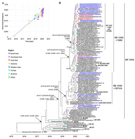 Evolution of Bangladesh H1N1pdm subclade 6B.1A5A strain 2020. (A) A root-to-tip analysis of the dataset. (B) The maximum clade credibility (MCC) tree based on the HA gene of H1N1pdm was estimated in BEAST package v1.10.4 with HKY + F + I, an exponential population growth model, and the relaxed molecular clock. The nucleotide sequences of the HA genes retrieved from EpiFlu GISAID are labeled as follows: isolate name|isolate ID|collection date (yyyy-mm-dd). The H1N1pdm strains, including the H1N1pdm subclade reference strains, are shown in black, with the clade name highlighted in gray at the end. Ranges of subclades 6B.1A1, 6B.1A2, 6B.1A3, 6B.1A4, 6B.1A5A, 6B.1A5B, 6B.1A6A, and 6B.1A7A are shown by vertical bars. Ranges of 6B.1A5A + 156K, 6B.1A5A + 187V/A, and 6B.1A5A + 156K with K209M are shown by vertical doted bars. Asterisks indicate the vaccine strains. The Bangladesh 2020 strains in EpiFlu and the newly obtained Bangladesh 2020 sequences in the present study are shown in blue and red, respectively. The regions in which the strains circulated are indicated at the branch tips and are color-coded as indicated in the legend on the left. The x-axis of the tree indicates the time (year). The tMRCA and interval, posterior probability (PP), and the occurrence of amino acid mutations of the key nodes are indicated by arrows.