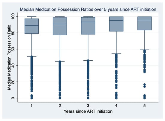 In the present study, there was a significant improvement of adherence to ART at one year among those initiated on therapy in 2018 and 2019 compared with 2015. Those initiated recently are probably more adherent and it could be that pre-ART counseling is better performed now than it was before. Additionally, longitudinal data over five years suggest an increase in median MPR from 2015 to 2019. This could mean that, as the patient is exposed to CTC for a longer duration, they get used to the experience, improving their adherence to ART. Similar to other studies [24,25] we found that once-daily dosing compared with twice-daily dosing was associated with two times higher odds of being virologically suppressed. Most of the once-daily regimens are relatively newer and more potent with fewer side effects and less resistance, likely contributing to the improved virological suppression observed.
