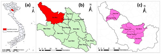 (a) Map of Vietnam with Hoa Binh province indicated; (b) Hoa Binh province and its districts; and (c) Da Bac district with six studied communes (pink).