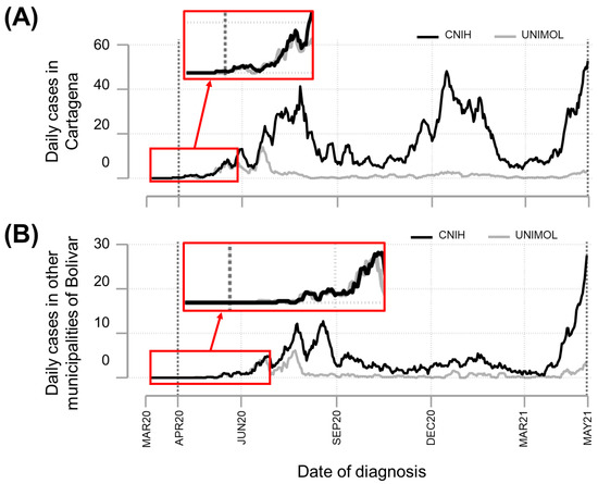 Comparison of epidemic curves based on data from two data sources, as of 31 April 2021. Daily new confirmed COVID-19 cases in Bolívar were used to build epidemic curves using 7-day moving averages. The curves were constructed using public information from the Colombian National Institute of Health (CNIH) and Unidad de Investigación molecular (UNIMOL) of the Universidad de Cartagena. Red boxes indicate the time frames for which the epidemic curves had a similar pattern; ~3 and ~4 months for Cartagena (A) and other Bolívar municipalities (B), respectively.