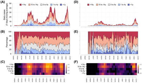 The case dynamics by age group and date of symptom onset were summarized for Cartagena and other municipalities in Bolívar (Figure 3). In comparison to other Bolívar municipalities, Cartagena had a larger number of cases (4.2×, Table 1) and major epidemic peaks between December 2020 and January 2021 (Figure 3A compared to D) that were apparently not related to outbreaks in specific age groups. The age group-specific incidence across the study period displayed low variation in Cartagena (Figure 3B,C), while a greater variability was observed in other Bolívar municipalities (Figure 3E,F). No difference was observed in the age-stratified occurrence (Figure 4A,C,D,F) or proportion (Figure 4B,E) of cases for Cartagena and the other municipalities of Bolívar.