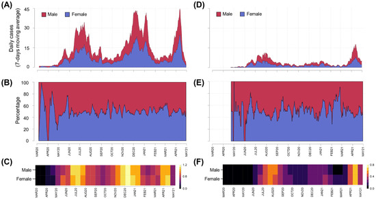 Sex-stratified epidemic curves for Bolívar and Cartagena, as of 31 April 2021. Daily confirmed new cases were presented using epidemic curves (panels (A,D)) and stacked area plots (panels (B,E)) on linear scales, while cases per 100,000 population were presented using heat maps (panels (C,F)) with log(x + 1) scales to improve readability. Data for Cartagena (panels (A–C)) and other municipalities of Bolívar (panels (D–F)) were presented using symptom onset dates and 7-day moving averages.