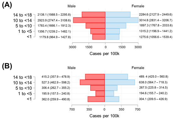 The COVID-19 incidence among males and females was comparable after stratifying by age and residence (Figure 5). However, both in Cartagena (Figure 5A) and in other municipalities (Figure 5B), the incidence was higher in the 10 to <14 years old group compared to other age groups. Additionally, in Cartagena, the group with the lowest incidence of COVID-19 was children under one year of age, while in the other municipalities of Bolívar, the group with the lowest incidence was those aged 1 to <5 years of age.