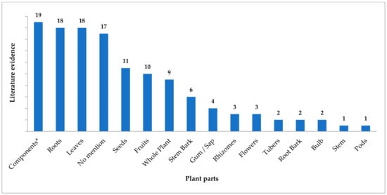Many articles from modern literature give a fair idea about plant parts used as snake venom antidotes. These references are from both traditional mentions and pharmacological research. Different plant parts might hold specific chemicals that bring about desired pharmacological effect making them important for the particular action. Figure 1 depicts the frequency of various plant parts appearing as snake venom antidotes from modern literature. The highest number of mentions were found for extracted or isolated components followed by roots and leaves. Various remedies from the traditional literature mention utility of roots and leaves as useful plant parts. The remedies where no specific plant part was referred are also significant in number. Seeds, fruits and stem bark hold intermediate places in utility, and all other plant parts were sparsely used in the therapies.
