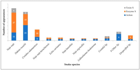 Toxins in snake venom impair critical physiological functions in the victim’s body. Though the majority of references were found on enzyme inhibition, a few references on toxin inhibition were found. Naja naja venom being most investigated, and the highest number of reports was on neutralization of neurotoxins (6). As Daboia russelii was the second-highest investigated species, following neurotoxins, and reports on myotoxins (5), cardiotoxins (2) and cytotoxin (1) were recorded. Refer to Figure 2 and Table 5 for snake venom toxin inhibition by plants (label: Toxin X).