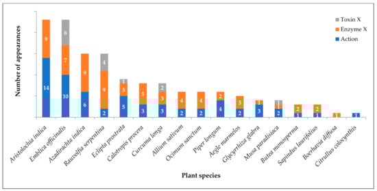 Of the 66 plant species identified from traditional literature, 17 have modern evidence indicating the neutralization of various snake venom components. Aristolochia indica precedes with most references [17,69,74,86,88,97,98,99,100,101,102,103,104,105,106,107,108,109,110] in both traditional and modern literature. In Marathi, it is known as Saapsund. The first half of the name Saap means snake, and it occurs in many traditional references as a cure for snakebite. It shares the first position with Emblica officinalis [64,118,143,144,145] which is a medicinally important plant in India. Various references demonstrate its effectiveness as an antidote for snake venom. Azadirachta indica [17,64,69,74,151,164,165,166,167,168,169,170,171,172,173] and Rauvolfia serpentina [17,18,69,87,88,89,90,91,92,93,94,95,96] hold second place in pharmacological evidence. Figure 3 depicts the number of appearances in references for each plant species as a snake venom antidote (labels as mentioned in the earlier section).