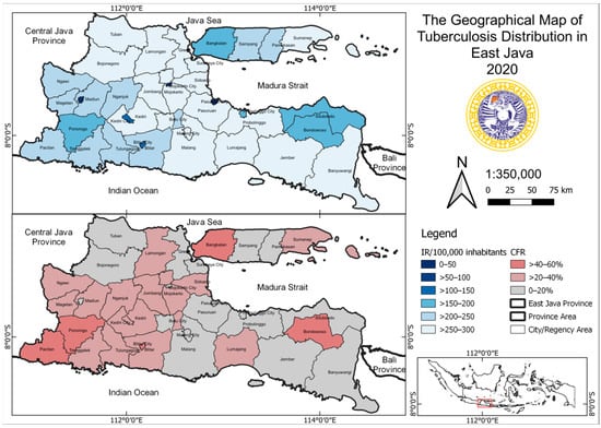 p < 0.05). The incidence rate of tuberculosis in East Java Province (586.24/100,000 inhabitants) in 2020 was higher than the national incidence rate (301/100,000 inhabitants). Furthermore, there was a decreasing incidence rate of tuberculosis in 2020 (95.49/100,000 inhabitants) compared to that in 2019 (95.925/100,000 inhabitants) [
