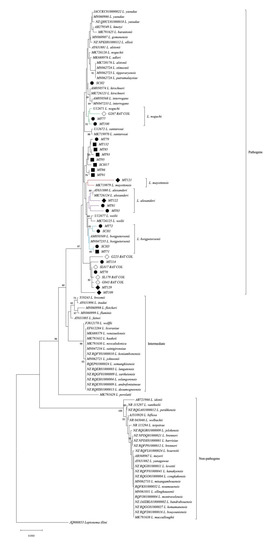 Out of the 44 16S rRNA positive samples, 35 good-quality sequences were obtained, of which 23 were different and exhibited an overall identity of 77.27% to 99.3%. Phylogenetic analysis of the partial 16S rRNA gene reference sequences showed a proper classification into pathogenic, intermediate, and nonpathogenic subgroups. All Leptospira sequences obtained from the Macaregua cave clustered within the pathogenic species group (Figure 1), and 12/44 sequences displayed identity values between 85.56% and 99.3% with reference sequences of Leptospira currently described species, clustering with the following species: Leptospira noguchii (4/44), Leptospira alexanderi (3/44), Leptospira borgpetersenii (4/44), and Leptospira mayottensis (1/44) (Figure 1 and Table 3).