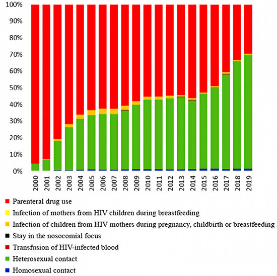 The HIV patients’ structure by the main known infection factors in Russia from 2000 to 2019 (according to the Russian Federal AIDS Center).