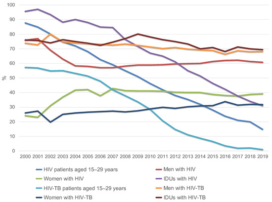 Among the entire group of HIV patients in 2019 and 2020, the main transmission route was sexual [7,8]. The proportion of drug users decreased to 33% in 2019 and 31% in 2020 [8,14] compared to 95.6% in 2000 [14,16]. At the same time, the proportion of drug users among patients with HIV-TB coinfection practically does not decrease. This group makes up the designated (reduced compared to 2000) percentage of HIV-infected people with intravenous drug use. In 2000, 76% of HIV-TB patients received intravenous injections; in 2019, the figure was 69.4% [13].