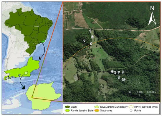 Sampling sites in the Sana Environmental Protection Area of the Private Reserve of the Gaviões Natural Heritage (RPPN Gaviões), Rio de Janeiro, Brazil. Maps were prepared using the QGIS 3.14.16 software and edited in Adobe Photoshop CS5 and CorelDraw X5. Reprinted from QGIS 3.14.16, a program under a CC BY license, with permission from Jeronimo Alencar—Fiocruz, original copyright 2021. The coordinates of the collection sites are as follows: Site 1: 22°34′08.5′′ S 42°31′39.0′′ W; Site 2: 22°34′11.9′′ S 42°31′37.7′′ W; Site 3: 22°34′15.7′′ S 42°31′38.6′′ W; Site 4: 22°34′13.9′′ S 42°31′42.5′′ W; Site 5: 22°34′31.9′′ S 42°31′25.0′′ W; Site 6: 22°34′32.7′′ S 42°31′24.6′′ W; Site 7: 22°34′32.8′′ S 42°31′22.4′′ W; Site 8: 22°34′35.4′′ S 42°31′22.3′′ W; Site 9: 22°34′32.4′′ S 42°31′19.9′′ W; Site 10: 22°34′36.9′′ S 42°31′20.1′′ W.