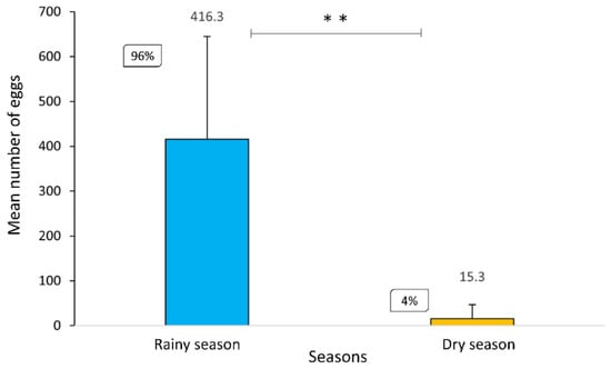 Statistically significant difference between the mean and standard deviation of the number of eggs collected in the rainy (December to March) and dry (June to August) seasons in the RPPN Gaviões (U = 0.00, Z = 2.88, p = 0.004). ** p ≤ 0.01.