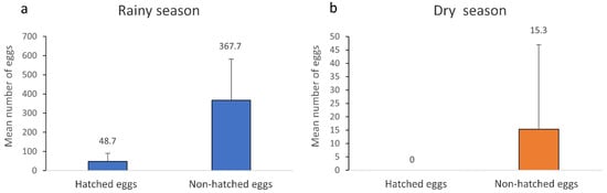 Mean and standard deviation of the number of hatched and non-hatched eggs from all Culicidae species collected from June to September 2020 in the RPPN Gaviões in the rainy (a) and dry (b) seasons.