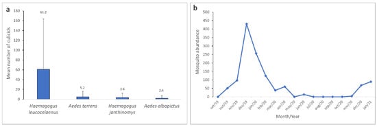 Culicidae of epidemiological concern collected from September 2019 to January 2021 in the Gaviões Reserve. (a) Mean and standard deviation for Haemagogus leucocelaenus, Aedes terrens, Haemagogus janthinomys, and Aedes albopictus. (b) Monthly mosquito abundance from September 2019 to January 2021.