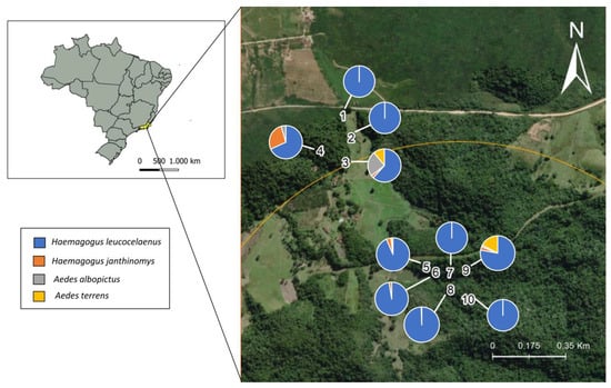 Ovitraps with eggs were evaluated to determine the abundance of different Culicidae species. The most abundant species, found in all locations sampled, was Hg. leucocelaenus, being the only species found in sites 1, 2, 7 and 10 (Supplementary Table S1). Hg. janthinomys was found in 70% of the sites, Aedes albopictus in 40% and Ae. terrens in 30%. Hg. leucocelaenus and Hg. janthinomys were frequently found together in the same larval habitat, in 6 of the 10 collection sites. Co-occurrence of all vector species was observed for sites 3, 5, and 9 (Figure 5).