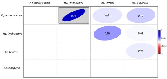 Spearman’s correlation for the abundance of eggs of Culicidae species Hg. leucocelaenus, Hg. janthinomys, Ae. albopictus, and Ae. terrens that oviposited on the same paddles from September 2019 to January 2021 in RPPN Gaviões. p ≤ 0.05.
