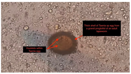 Microscopic slide view (magnified 1600×), Showing a thick wall egg shed from a gravid proglottid of a Taenia sp. containing embryo hooklets (red arrows in slide) in the stool sample of our patient three months following symptoms onset.