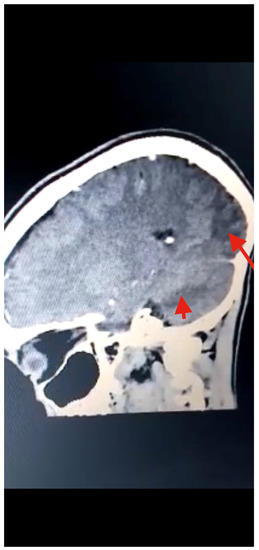 Head CT scan showing multiple T1W hypointense, with T2W and FLAIR hyperintense, areas in the posterior and parietal cortices, indicative of infarction (red arrows) due to stroke from cysticercal invasion of the vascular bed.