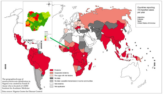 WHO and NCDC T. Solium map depicting endemic regions in the world and in Nigeria, respectively [6,12]. Reprinted with permission from ref. [6]. Copyright 2016 World Health Organization and 2018 Nigeria Center for Disease Control.
