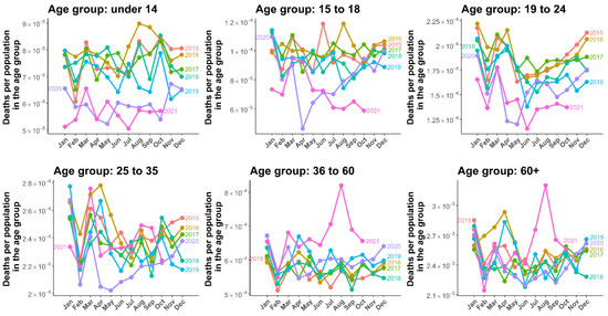 All-cause mortality in men. Lines illustrate the mortality by six age groups (0–14, 15–18, 19–24, 25–34, 35–60, and over 60 years of age) starting from January 2015 to October 2021.