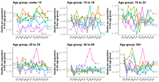All-cause mortality in women. Lines illustrate the mortality by six age groups (0–14, 15–18, 19–24, 25–34, 35–60, and over 60 years of age) starting from January 2015 to October 2021.