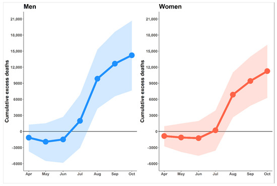 Cumulative excess deaths by gender starting from April to October 2021. Lines illustrate the cumulative excess deaths by gender. Shaded areas show 95% prediction intervals.