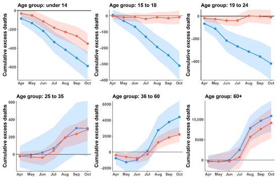 Cumulative excess deaths by gender and age groups. Lines illustrate the cumulative excess deaths by gender and age groups. Blue and orange lines represent men and women, respectively. Shaded areas indicate the 95% prediction intervals.
