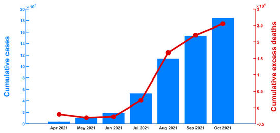 Excess deaths and confirmed COVID-19 cases. Bars show cumulative COVID-19 cases from April to October 2021. The red line indicates cumulative all-cause excess deaths.