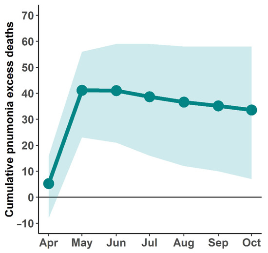 Cumulative pneumonia excess deaths. The line illustrates the cumulative pneumonia excess deaths starting from April to October 2021; the shaded area indicates the 95% CI.
