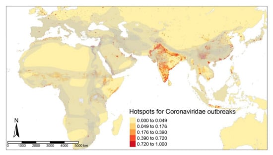 EVDs and coronaviral diseases have also been found to be associated with human-modified landscapes. EVDs have long been linked to landscape alterations, such as deforestation, mining, population growth, and land fragmentation [,,]. Our results show that EVD outbreaks are not directly related to population densities, contrary to a recent study [], but rather to the effects of population increases on human-modified landscapes, such as urbanization, deforestation, mining, and hunting. In contrast, population density was significantly related to coronavirus hotspots. Whether high population density leads to observer bias and, thus, to increased reporting of outbreaks needs to be examined in detail. The report of a SARS-like pneumonia in 2012 in miners in Tongguan, Mojiang [] raises the issue of potentially unreported sporadic outbreaks in regions with limited populations. Studies show that the emergence of coronaviral diseases, such as SARS [] and MERS [], is directly related to exposure to body fluids from mammals raised in confined spaces for bushmeat and recreational activities, respectively. “Wild flavor” bushmeat restaurants and markets are often located in densely populated cites, where the demand for exotic proteins is high [,], and cases are, therefore, more likely to be reported in densely populated areas. In the case of MERS, there is an increase in reporting in large cities as camel owners seek treatment for respiratory distress in tertiary hospitals located in large cities and are, therefore, more likely to report cases []. The effect of population density is, however, crucial in the spread of epidemics and, therefore, remains an important factor in the detection of hotspots and active surveillance.