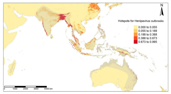 We also found that low elevation and high rainfall have a significant influence on the distribution of Henipavirus outbreaks. Consistent with our results, studies have hypothesized that the emergence of Nipah in the lower Gangetic plains and low-lying marshes could be attributed to flooding, which leads to the destruction of mammalian habitats []. Rapid changes in ecological habitats due to human land-use changes lead to the starvation and migration of fruit bat species (Family Pteropodidae), reservoirs of Nipah virus, with contamination of fruit trees near human habitations and increased exposure to the pathogen [,,]. Our results support this hypothesis of the increased risk of Nipah outbreaks associated with lowland plains, flooding, and rapid human-induced habitat changes.