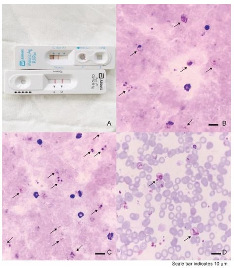 Malaria and COVID-19 diagnostic test results. (A) A malaria rapid diagnostic test (upper) was Pan-Plasmodium-positive and a SARS-CoV-2 antigen test (lower) was positive. (B,C) Thick blood film showing several stages of P. vivax (arrows), magnification ×1000, Giemsa’s stain. (D) Thin blood film showing infected red blood cell with P. vivax (arrows), magnification ×1000, Giemsa’s stain.