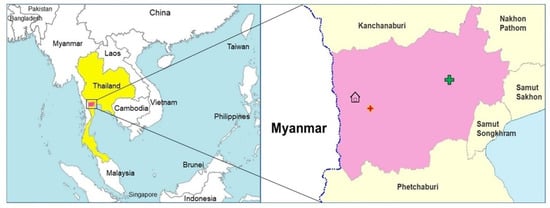 The map display of the patient’s house located in Suan Phueng District, Ratchaburi, Thailand, where the red and green crosses indicate the malaria post and district hospital, respectively.