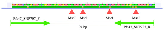 94 bp fragment of the pfs47 gene indicating the primer target sites and four MseI cutting points.