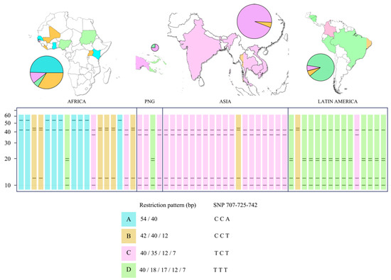 Four restriction patterns were identified (Figure 2) among the 56 sequences analyzed. Pattern A had two bands (54/40 bp) derived from the CCA haplotype at positions 707/725/742. Pattern B revealed three bands (42/40/12 bp) with CCT haplotype. Pattern C showed four bands (40/35/12/7 bp) with the TCT haplotype, and pattern D showed five bands (40/18/17/12/7 bp) with the TTT haplotype. Patterns A and B were more common on the African continent, although representatives of all four restriction profiles were found. Pattern C was the most common in Asia, although one strain with pattern D (from Papua New Guinea) and another strain with pattern B were also found. Pattern D was the most common in Latin America, but a Colombian isolate with pattern C and a Brazilian isolate with pattern B were found.