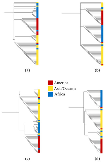 Cladograms constructed with the UPGMA method using (a) 56 sequences of 1282 nucleotides of the pfs47 gene; (b) sequences of 94 nucleotides from domain 2 of the pfs47 gene; (c) sequences of 427 residues of the putative protein PfS47; and (d) 56 sequences of 31 predicted residues of domain 2 of the PfS47 protein. Colors indicate the geographic origin of Plasmodium falciparum isolates.