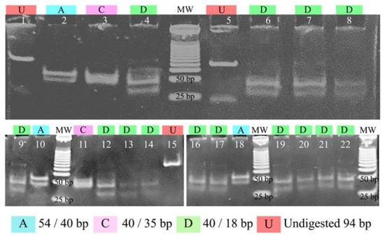 The amplification products of the 94 bp segment were digested with the enzyme Tru1I (MseI) (cutting site T^TAA) (Thermo Fisher Scientific Inc., Waltham, MA, USA) in 31 μL as the final volume including 18 μL of nuclease-free water, 2 μL of 10× buffer B, 10 μL of PCR product, and 1 μL of the enzyme 10 U/μL. The reaction was incubated at 65 °C for 8 h. Undigested products and digested fragments were separated on a 12% nondenaturing polyacrylamide gel (PAGE) at 20 v and 5 mAmp and Gel Loading Dye, Orange (6×). Subsequently, the gels were stained with ethidium bromide in 1× TBE buffer for 15 to 30 min.