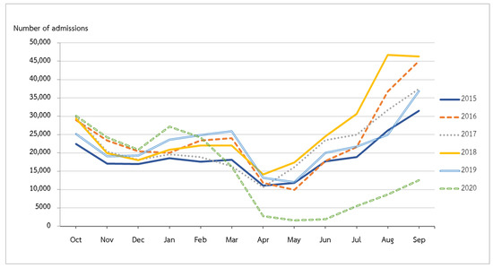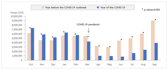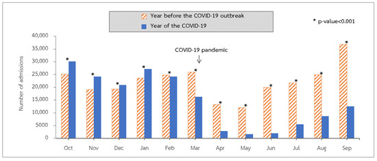 From the beginning of the 2015 fiscal year to the end of fiscal year 2019, hospitalizations for LRTIs peaked in September and reached their lowest point in April and May (Figure 1). Admissions declined in fiscal year 2020 compared to the same months in fiscal year 2019. The COVID-19 outbreak in Thailand began around the middle of March 2020. We observed that admissions in April 2020 were considerably lower than those in April 2019 (p value < 0.001). After the continuation of the rainy season from May to September 2020, admissions increased but remained lower than in the corresponding month of fiscal year 2019 (p value < 0.001) (Figure 2).