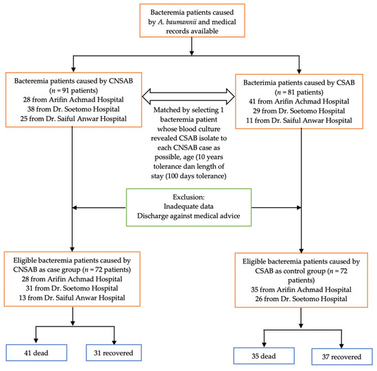 Cases were defined as bacteremia patients from whom CNSAB was isolated from their blood. Controls were patients with bacteremia from whom carbapenem-susceptible A. baumannii (CSAB) was isolated from the blood specimen. Samples were collected retrospectively from January 2019 to December 2021, with the ratio of cases and controls being 1:1. Controls were matched with the cases based on the time of hospital admission (i.e., the control and case were hospitalized at approximately the same time), age, and length of hospital stay. Patients with the absence of medical records or inadequate data and discharged against medical advice were excluded. The flowchart of the enrolled cases and controls is described in Figure 1. A case report form (CRF) was prepared and used to collect the data from the medical records and the hospital databases.