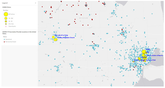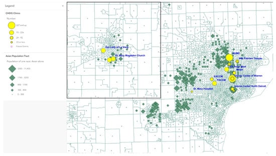 GIS technology has been used in previous vaccination research for planning vaccination campaigns, identifying populations that have not been vaccinated, and assessing the progress of vaccination campaigns [15,16,17,18]. As EMU CHDIS began planning and implementing mobile COVID-19 vaccination clinics for underserved AA communities in Michigan, the project team used spatial analysis in optimizing the location of vaccination sites and the distribution of vaccines. Specifically, we applied GIS mapping to assess the aforementioned needs geographically to ensure we were setting up vaccination sites in underserved neighborhoods. Sites of vaccination clinics included community centers, places of worship, Asian markets, and federally qualified health centers where community members gathered and/or received healthcare services. Using EMU CHDIS vaccine maps, the project team gained insights about variation in vaccine distribution and coverage metrics among priority populations in the locations where AAs reside, which helped the project team and EMU CHDIS community partners develop strategic vaccine distribution plans.