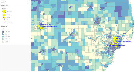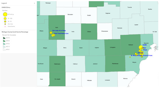The project team focused on the state of Michigan as the geographic area and used the counties and census tracts in the state of Michigan as the units of the mapping project. The county boundaries and census tracts GIS data were downloaded from the U.S. Census TIGER Geodatabases [19]. In addition to the GIS boundaries data, we identified the following variables as vaccine determinant layers in our GIS project: COVID-19 vaccination locations in the United States crowdsourced from URISA’s GISCorps [20], Michigan vaccination rates from Michigan COVID-19 Dashboard [21], the AA population, populations with no health insurance, and populations with no internet access by census tract from U.S. Census Bureau American Community Survey 5-year data (2016–2020) [22], and Michigan Social Vulnerability Index by census tract from CDC [23]. These variables were joined with the census tract or county GIS data to support the overlay analysis in the project. In addition, we geocoded all of the EMU CHDIS mobile clinics using the address information and converted the clinic events table into GIS point vector data, with the accurate latitude and longitude geographic coordinates for each event. All the data were managed using ESRI ArcGIS Pro software [24].