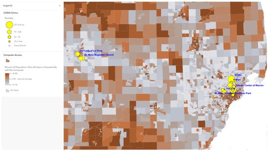 Map 1 (Figure 1) used ArcGIS Online to show a total of 41 CHDIS mobile clinics as of May 2022 in geographic locations (symbolized in yellow circles); these community-based clinics improved the coverage of vaccine opportunities based on the existing COVID-19 vaccination provider locations. Map 2 (Figure 2) used the graduated symbols of the AA population in each census tract to demonstrate that EMU CHDIS mobile clinics have successfully reached the priority population, AA, in areas where the concentration of AA population is medium-to-high. Map 3 (Figure 3) presented the overall population COVID-19 vaccine uptake percentage by county in Michigan and showed that EMU CHDIS mobile clinics played a role in narrowing the vaccine disparity gap between counties. Map 4 (Figure 4) shows that 12 out of 41 EMU CHDIS mobile clinics were offered in places with a medium-to-high percentage (greater than the national average percentage of 8.8%) of individuals with no insurance. Similar patterns were also noted in Map 5 (Figure 5) where 31 out of 41 CHDIS mobile clinics were situated in areas where the percentage of households that have no computer access is above the national average percentage (3.3%), which is often considered a critical barrier for accessing COVID-19 vaccines. As shown in Map 6 (Figure 6), more than 75 percent of EMU CHDIS mobile clinics were offered in communities with medium-to-high SVI (greater than the state average percentage of 0.5). This map also illustrates that socially vulnerable communities are being incorporated into key public health decision-making and activities when EMU CHDIS mobile clinics were set up to allocate, distribute and administer the COVID-19 vaccines.