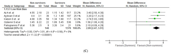| Özdemir IH et al. [29] | 2021 | Turkey | 350 (194) | 55 (39–70) | Mortality | 5.35 (3.42) | 0.66 (0.92) | NR | NR | NR | NR |