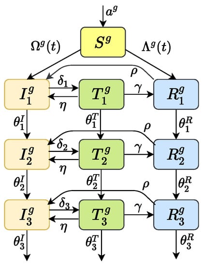 Transmission process diagram. The superscript g can be and b, respectively, which represents the four types of subgroup populations. Parameter a is an input of susceptible individuals; are the disease progression rates in infection stage 1, 2 and 3, respectively; are the treatment rates of patients in stage 1, 2 and 3, respectively; is the percentage of patients who give up HAART; is rate of drug resistance after HAART; is the percentage of patients who are no longer resistant.