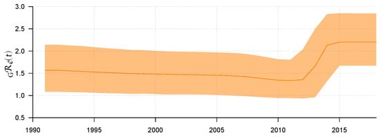 Use R software to visualize ; then, the result can be found in Figure 2. Figure 2 shows the median line of and its 95% HPD interval from 1992 to 2018. Before 2011, we can see that the epidemic showed a relatively stable transmission trend through sexual route. The value of remained stable and slightly decreased, with a median value of about 1.33 (95% HPD: 0.94–1.8). However, from 2011 to 2014, rose rapidly to 2.13 (95% HPD: 1.32–2.83) for some reason. After 2015, remained stable, with its median value maintained at approximately 2.20 (95% HPD: 1.67–2.85). Some explanations will be given later on the possibility of rising in this period.