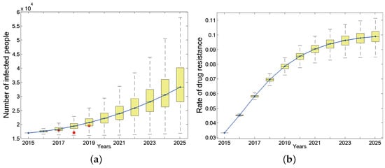 The number of HIV-positive people in the entire population (a) and drug resistance rate (b), where the continuous curve is the median line. Red dots in (a) are reported cases of 2017, 2018 and 2019 respectively.