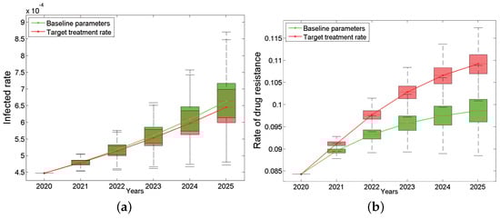Impact of target treatment rates on the HIV/AIDS epidemic: the infected rate (a) and the rate of drug resistance (b). The green box plots are based on the baseline parameters, while the red ones are based on target treatment rate. The continuous green and red curves are their median lines respectively.